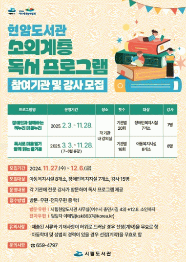 시 관계자는 “아동·장애인을 위한 독서 프로그램을 제공해 소외계층의 문화 향유 기회를 확대하고자 마련했다”며 “지역 내 복지시설의 많은 참여를 바란다”고 전했다.