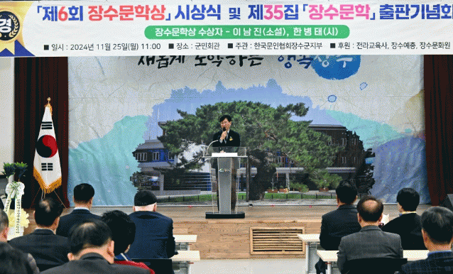 이번 행사는 장수문학상 운영 경과보고, 이명희 운영위원장의 심사평, 산문 및 운문 부문 시상식 순으로 진행됐으며, 제6회 장수문학상은 산문 부문에 소설가 이남진, 운문 부문에 시인이자 장수문화원장인 한병태 회원에게 수여됐다.