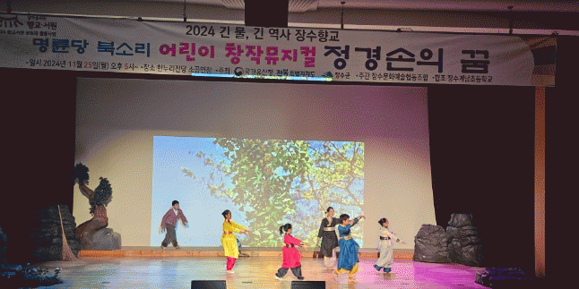 장수문화예술협동조합이 주관한 이날 행사는 계남초등학교 학생들과 함께 보물 ‘장수향교 대성전’을 배경으로 정유재란 당시 향교를 지켜낸 ‘충복 정경손’의 이야기인 ‘명륜당 북소리’를 주요 공연으로 선보였다.