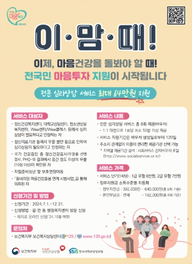 지원 대상은 △정신건강복지센터, 정신의료기관 등에서 심리상담이 필요하다고 인정된 자 △국가건강검진에서 중간 이상 점수(10점 이상)를 받은 자 등이고, 대상자에게는 1:1 대면 심리상담 서비스를 받을 수 있는 이용권(바우처)이 제공된다.