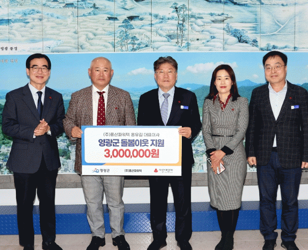 영광군 관계자는 “경기가 얼어붙은 어려운 시기에도 꾸준히 기부해 주신 홍유길 대표님 이야말로 어려운 이웃에게 삶의 희망을 밝히는 등불 같은 분이다.”라며, “기탁하신 성금은 관내 어려운 이웃들이 추운 겨울을 잘 날 수 있도록 잘 전달하겠다.”라고 말했다.