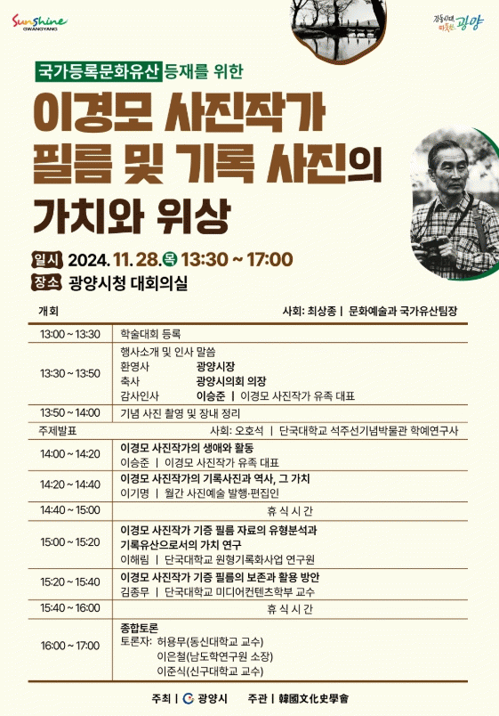 이번 학술대회는 한국의 대표적 다큐멘터리 사진작가이자 근현대사의 기록자인 이경모 작가의 기증 필름 자료를 국가등록문화유산으로 등재하기 위해 마련된 자리다. 관련 분야의 전문가들이 참여해 이경모 작가의 작품이 가진 예술성과 역사적 기록물로서의 가치를 심도 있게 논의할 예정이며 관심 있는 시민이면 누구나 참여할 수 있다.