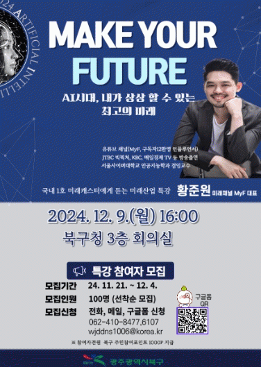 27일 북구에 따르면 오는 12월 9일 오후 4시 북구청 3층 회의실에서 ‘인공지능 시대, 내가 상상할 수 있는 최고의 미래’ 주제로 ‘황준원 교수의 4차 산업혁명 특강’이 열린다.