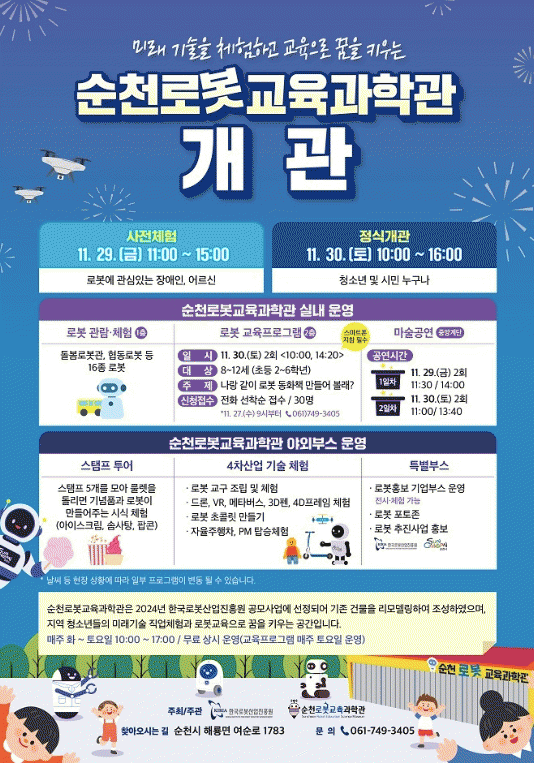 30일에는 순천로봇교육과학관 정식 개관과 로봇에 관심 있는 시민 누구나 참여할 수 있는 로봇 체험회가 개최된다.