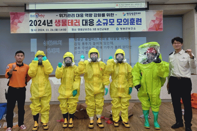 이번 훈련은 영광군 고추특화시장 내 의문의 남성이 흰색 가루를 뿌리고 달아나는 상황을 설정해 초기대응 교육, 개인보호구(레벨 A, 레벨 C) 착·탈의, 3중 수송용기 사용 및 검체 이송 실습 등 실전 대응에 맞춰 체험형 시연으로 진행했다.