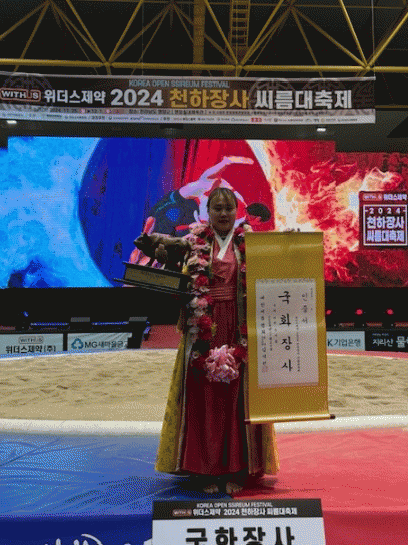국화급 엄하진 선수는 결승전에서 정수영 선수를 2대 0으로 완벽히 제압하며 올해 첫 국화장사 타이틀을 차지했다.