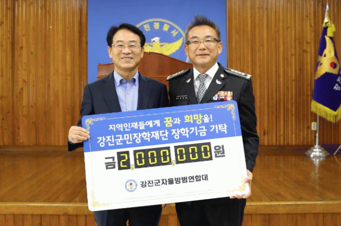 27일 강진군에 따르면 지난 16일 강진경찰서 3층 어울마당에서 열린 강진군 자율방범연합대 방범의 날 기념식 및 가족한마음대회 행사를 맞아 김태형 연합대장이 장학금 200만 원을 강진군민장학재단에 기탁했다.
