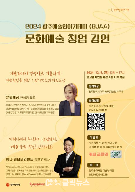 50명 선착순 모집하며, 강연에 대한 자세한 사항(예술누리팀 담당자 문은주 062-670-5728)과 신청 링크 주소는 광주문화재단 누리집 공지사항 안내문을 통해 확인할 수 있다.