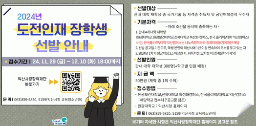 대상은 익산시에 주소를 둔 지역 대학교 재학생이며, 참여 가능 학교는 △원광대학교 △원광보건대학교 △전북대학교 특성화캠퍼스 △한국폴리텍V대학 익산캠퍼스다. 접수 기간은 오는 29일부터 12월 10일까지다. 신청은 각 학교 접수처와 익산시청 누리집을 통해 진행된다.