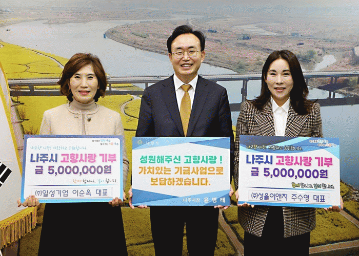 윤병태 나주시장은 “고향사랑기부제에 적극 동참해주신 두 대표님께 깊이 감사드린다”며 “기부금은 두 분의 따뜻한 마음과 뜻을 담아 주민 복리 증진과 나주시의 발전을 위해 적극 활용하겠다”고 말했다.