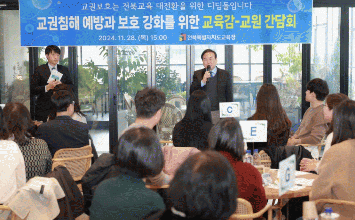 전북특별자치도교육청은 28일 전주시 효자동 아카시아홀에서 서거석 교육감과 교원 40여 명이 참석한 가운데 ‘교권침해 예방과 보호 강화를 위한 교육감-교원 간담회’를 개최했다.