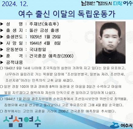 한편, 여수시는 독립운동의 역사적 가치를 재조명하기 위해 독립운동가유족회와 공동으로 여수 출신 독립운동가를 발굴·선정하여 매월 시청 누리집, 공공기관 등에 게시하고 있으며, 현재까지 독립운동가 83명을 추서했다.