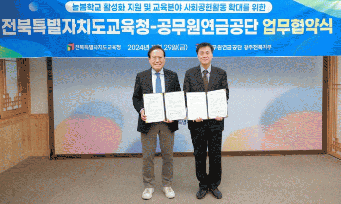 전북교육청은 29일 도교육청 6층 위원회실에서 공무원연금공단 광주전북지부(조영철 지부장)와 ‘늘봄학교 활성화 지원 및 교육분야 사회공헌 활동 확대’를 위한 업무협약을 체결했다.