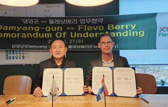 담양군과 네덜란드 플레보베리 간에 체결된 이번 협약은 기존 업무협약 만료에 따라 담양 육성 딸기의 품종유지 및 신품종 딸기 육종을 위한 협업을 위해 이뤄졌다.