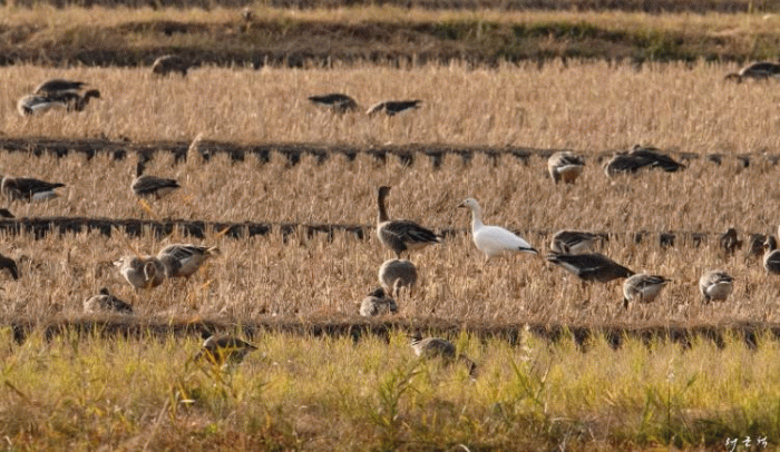 순천만 워킹 탐조 7시 프로그램에 참가한 탐조객이 흑두루미와 큰기러기 사이에서 볍씨를 먹고 있는 흰기러기를 처음 발견했다.