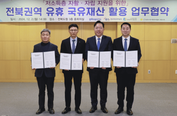 전북특별자치도는 2일 전북도청 중회의실에서 한국자산관리공사(캠코), 전북광역자활센터, 한국지역자활센터협회 전북지부와 함께 ‘유휴 국유재산 활용 자활사업 활성화’를 위한 업무협약을 체결했다.