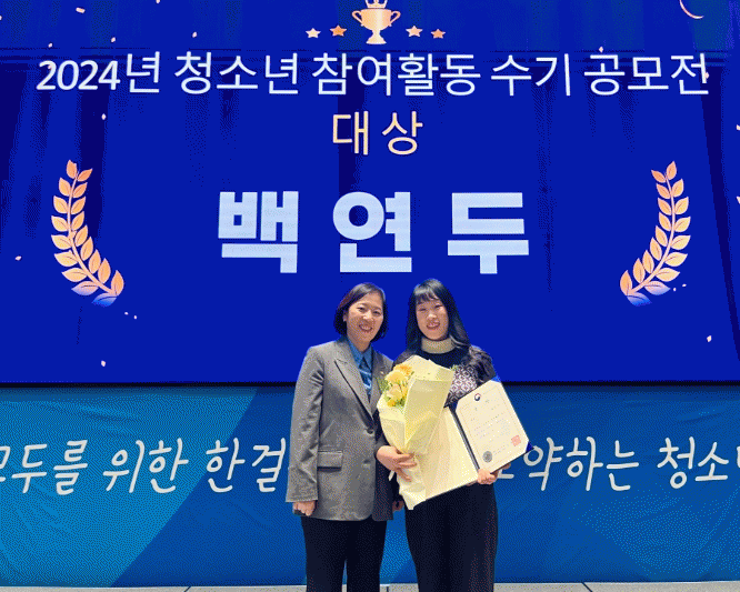 백연두 학생은 거창군청소년참여위원회 ‘we-chi’의 위원장으로 활동하며 청소년 정책 발굴과 다양한 참여 활동에서의 공로를 인정받아 수상의 영예를 안았다. 백연두 학생은 “대상이라는 큰상을 받게 되어 영광스럽다”라며 “청소년도 사회의 중요한 일원으로 정책을 만들고, 변화시킬 힘이 있다는 것을 알리기 위해 앞으로도 꾸준히 활동하겠다”라고 소감을 전했다.
