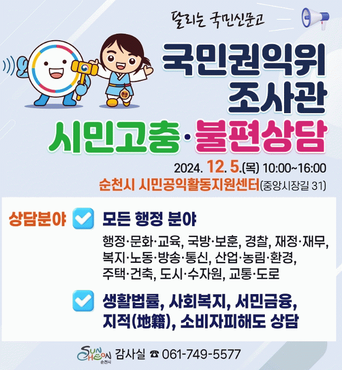 상담을 원하시는 시민은 읍면동 행정복지센터 또는 순천시 감사실을 통해 사전 상담 예약을 접수할 수 있으며, 당일 현장 접수도 가능하다.