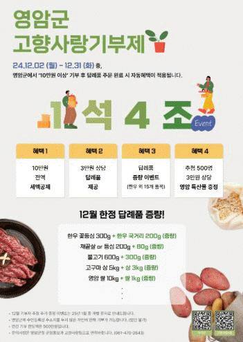 이번 이벤트는 연말정산 시즌을 앞두고 기부자들에게 다양한 혜택을 제공해 고향사랑기부제에 관심과 참여를 높인다는 취지로 마련됐다.