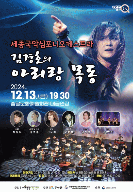 공연에서는 MBN 조선판스타 우승자 ‘정초롱’이 사회를 맡고, 섬세한 곡 해석과 유려한 테크닉으로 주목받고 있는 지휘자 ‘박상우’와 창단 32년을 자랑하는 세종국악심포니오케스트라(총감독 김혜성)의 연주가 펼쳐진다.