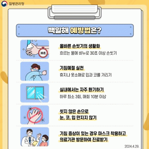 백일해 예방법으로는 ▲올바른 손씻기의 생활화 ▲기침 예절 실천 ▲실내 자주 환기하기 ▲씻지 않은 손으로 눈코입 만지지 않기 ▲기침 증상이 있는 경우 마스크 착용하고 의료기관 방문하여 진료받기 등이 있다.
