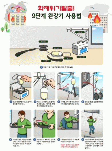 완강기 사용법은 먼저 상자 안의 모든 구성품을 확인하고, 스토퍼와 벨트를 꺼내 사용 준비 상태를 점검하는 것으로 시작된다. 이후 창문 가까이 지지대를 설치하고, 스토퍼를 고정해 떨어지지 않도록 한 뒤, 설치한 스토퍼와 지지대가 안정적으로 고정되어 있는지 다시 확인해야 한다. 다음으로 완강기 벨트를 몸에 착용하며, 벨트는 흘러내리지 않도록 가슴 높이까지 조절해야 한다. 벨트를 착용한 뒤에는 단단히 고정됐는지 재확인하고, 창문을 열어 탈출 방향의 장애물을 제거한다. 탈출 시에는 양손으로 로프를 잡고 천천히 아래로 내려가면서 속도를 조절하고 침착하게 움직이는 것이 중요하다. 마지막으로 지면에 안전하게 도착한 후에는 다른 사람들도 탈출할 수 있도록 도움을 주어야 한다.