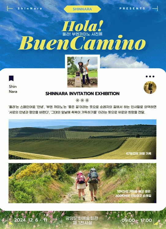 스페인어 인사말을 기획초대전의 제목으로 삼은 신나라 작가는 광양에도 세계인들이 찾는 둘레길이 만들어지길 바라는 마음에서 지난 2022년 47일간의 순례길 800km의 여정을 기록한 사진 작품 50여 점을 선보인다.