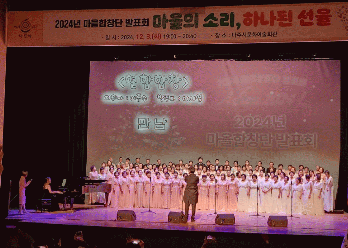 이번 발표회는 나주시 6개 읍면동에서 재능봉사로 활동 중인 마을합창단이 한자리에 모여 그간 갈고닦은 실력을 선보이는 무대였다. 주민들은 합창을 통해 성취감을 공유하고 음악을 매개로 소통하며 지역사회 화합을 다지는 의미 있는 시간을 가졌다.
