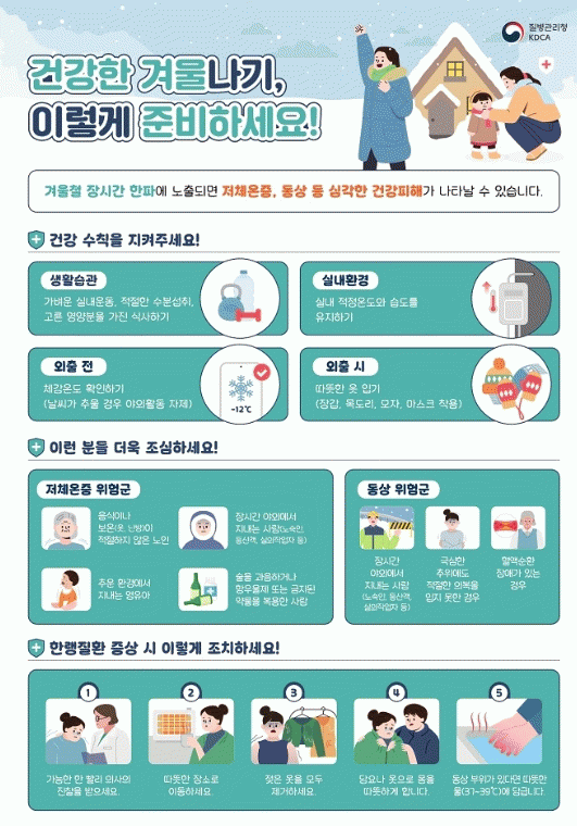 또한 외출 시에 내복이나 얇은 옷을 여러 벌 겹쳐 입어 몸을 따뜻하게 하고 실내 적정온도와 습도유지 및 체감온도를 확인하는 것이 중요하다.