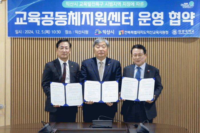 익산시는 익산교육지원청, 원광대학교와 함께 5일 교육발전특구 민관협력 조직인 '교육공동체지원센터' 운영 협약을 체결했다.