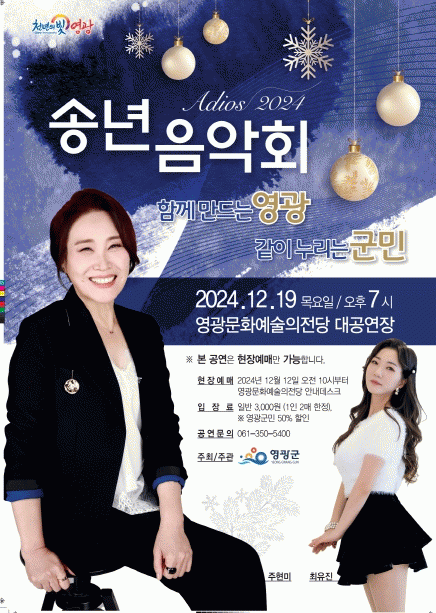 '함께 만드는 영광, 같이 누리는 군민'이라는 주제로 열리는 이번 송년음악회는 트로트의 황후로 불리는 대한민국의 대표가수 주현미와 함께하며 그간 수많은 사랑을 받은 명곡과 함께 연말을 더욱 뜻깊고 풍성하게 장식할 예정이다.