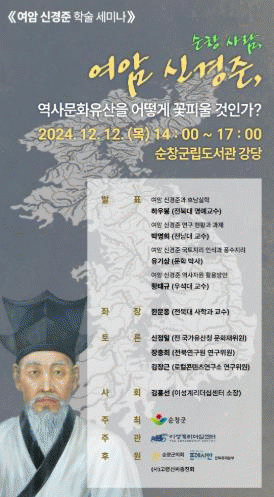 이번 학술세미나는 조선 후기 실학자로 지리학과 언어학 등 여러 분야에서 탁월한 업적을 남겼음에도 제대로 조명되지 못한 여암 신경준 선생을 다시 집중 조명하면서 순창지역의 역사문화자원으로 폭넓게 활용하자는 취지로 마련됐다.