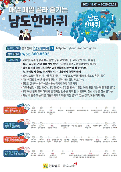 계절별 테마상품과 전남·광주 공동상품, 전남지역 주요 축제와 연계 운영 등 남도의 문화와 자연, 미식을 맛볼 다양한 코스를 9천900원부터 시작하는 착한 가격으로 운영, 큰 호응을 얻고 있다.