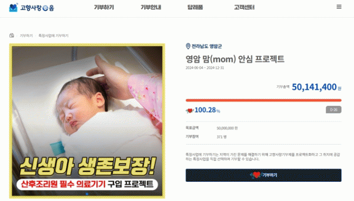 영암 맘 안심프로젝트는, 2027년 개원할 영암군 공공산후조리원의 의료기기 구입비를 마련하기 위한 기부로, 올해 6~12월을 기간으로 지정했는데 모금 171일만에 5,010만원의 성과를 올렸다.