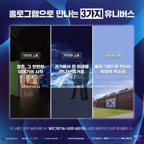 전북특별자치도 익산청년시청 지하 1층에 조성한 첫 번째 홀로그램 쇼룸‘홀로스테이션(HOLOSTATION)’은 청춘의 꿈으로 완성된 제2의 행성인 골디락스(Goldilocks) 찾기 프로젝트를 주제로 홀로그램 기술과 미디어아트를 융합한 신개념의 몰입형 전시를 선보인다.
