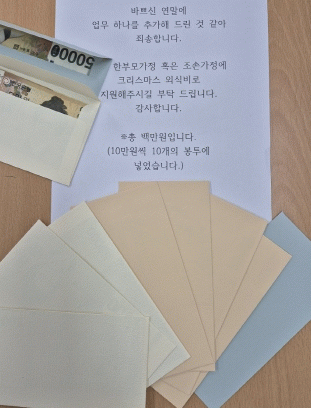 편지에는 “한부모 및 조손가족에 크리스마스 외식비로 지원해 주시기를 부탁한다”는 내용이 적혀 있었으며, 10만원씩 담아 만든 예쁜 봉투 10개가 함께 담겨 있었다.