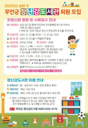 강명수 신도시지원단장은 “이번 모집 회원은 무안군에 주소를 둔 취학 전 아동의 보호자라면 누구나 신청할 수 있으며, 많은 군민이 이용할 수 있도록 하반기에도 회원 100명을 추가로 모집할 계획이다”고 전했다.