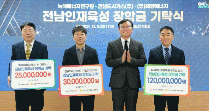 이날 정철실에서 열린 기탁식에는 명창환 전남도 행정부지사, 황규철 녹색에너지연구원장, 구자성 전남도시가스 대표이사, 정회 해양에너지 대표이사, 범희승 전남인재평생교육진흥원장 등이 참석했다.