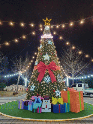불무공원에 설치된 대형트리는 색색의 조명과 산타할아버지가 가져온 풍성한 선물 상자들로 구성됐고, 공원 주변 각종 야간경관조명과 어우러져 군민들에게 온기와 희망을 전할 예정이다.