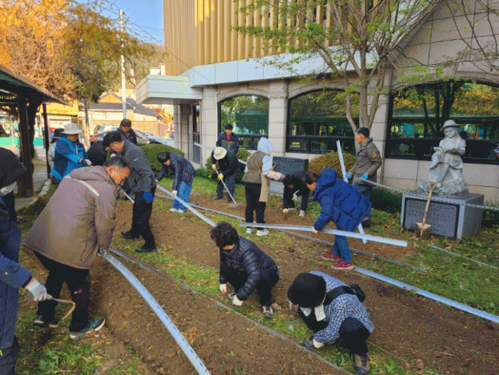 마지막 수업에서는 순천대 미래융합대학 박석곤 학장, 정원학과 김선화 교수 지도아래 수강생 30명(학생장 윤애현)이 참여해 도서관 소녀상 앞에 한 평 정원을 만드는 실습이 진행됐다.