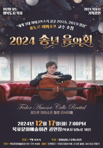 시는 세계적인 첼리스트 표도로 아마소프 교수와 피아니스트 김소영 교수를 초청해 오는 17일 오후 7시 목포문화예술회관에서 ‘행복도시 목포 2024 송년 음악회’를 선보인다.