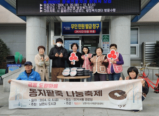 이날 행사는 남원시 도시재생사업 구역인 금동 도랑마을 주민들의 참여하에 ▲동지팥죽 만들기 ▲다함께 동지팥죽 나눔(80가구) 등 다양한 프로그램이 운영됐다.