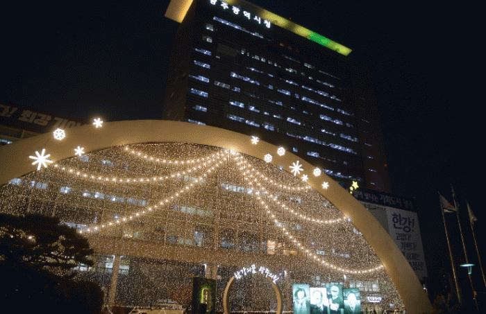 광주시는 행정동 앞 높이 12m, 길이 49m 크기의 아치형 구조물인 ‘빛고을무지개’에 발광다이오드(LED)로 조명을 설치하고, 전면부에는 광주 출신 한강 작가 노벨상 수상을 기념하는 포토존을 조성했다.