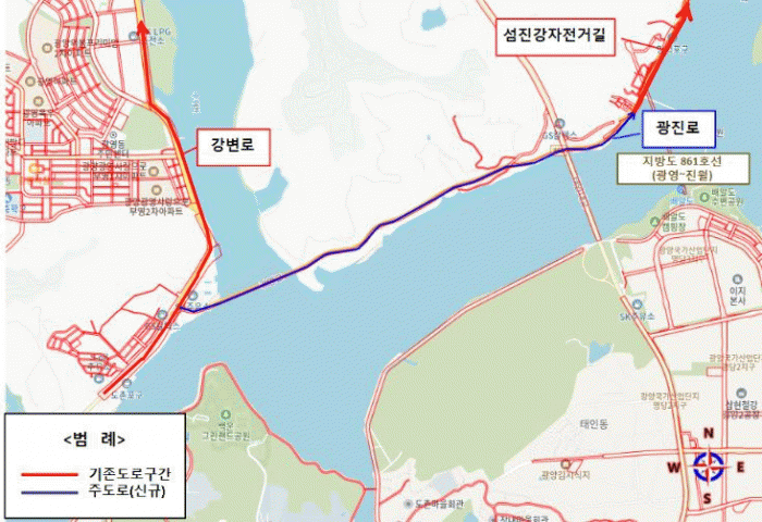 새로이 부여된 ‘용강5길’은 인근 용강지구의 도로명 인용 및 일련번호식 부여를 했으며‘중진길’과 ‘광진로’는 위치 예측성 및 지명을 고려해 부여했다.