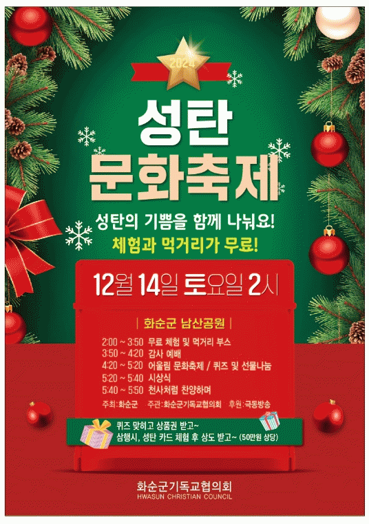 2024년 성탄문화축제는 성탄절을 맞아 사랑 나눔 문화를 확산하고 군민 화합의 장을 마련하기 위해 열리며, 화순군이 주최하고 화순군기독교협의회(회장 서재원) 주관으로 개최된다.