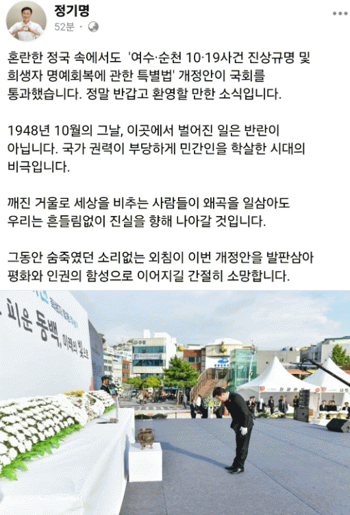 이어 “여순사건의 진상규명과 명예회복을 위해 끝까지 최선을 다하겠다”고 덧붙였다.