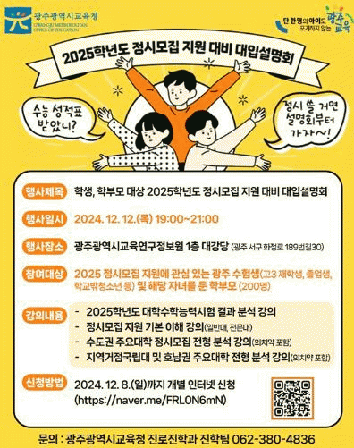 광주진로진학지원단 진학정보분석팀 교사들은 올해 수능 결과 분석, 정시모집(일반대, 전문대) 지원 기본 이해, 지역거점국립대 및 호남권 주요대학 전형 분석에 대해 설명할 예정이다.