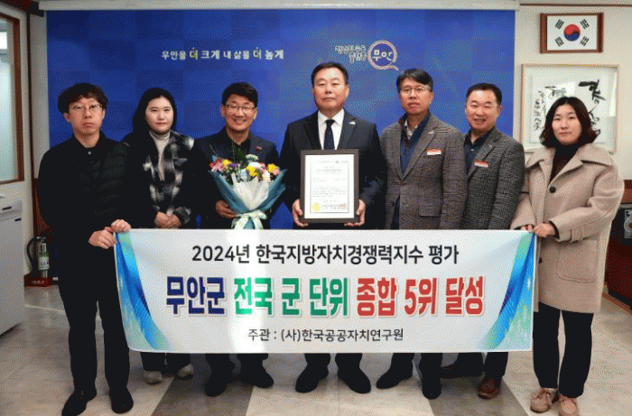 올해 이루어진 평가에서 무안군은 전국 82개 군 중에서 경영자원 부문(5위), 경영성과 부문(7위)를 달성했으며, 도내 시군 중 유일하게 전국 5위권 내에 진입했다.