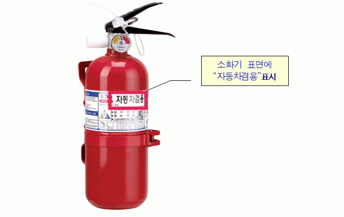 차량용 소화기는 일반 분말소화기의 성능시험뿐만 아니라 진동·고온시험으로 부품이탈·파손·변형 등 손상이 없는 것까지 검증 받아야 하고 소화기 용기 표면에 '자동차 겸용' 표시가 돼 있어야 한다.