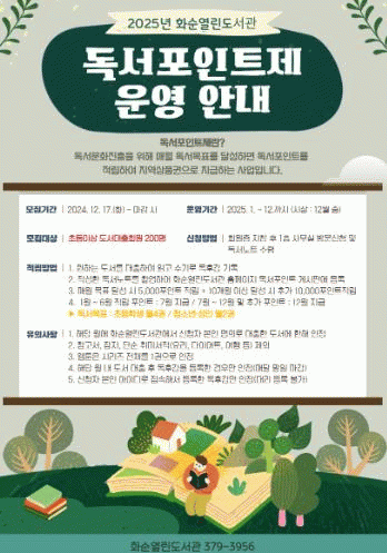 화순 열린도서관은 지역 주민들에게 독서에 대한 동기를 부여하고 독서문화를 확산하기 위해 “독서점수제(포인트제)”를 추진한다.